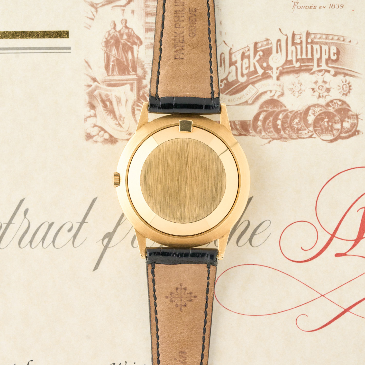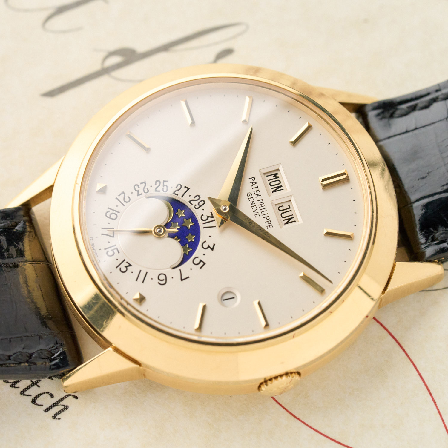 Márka: Patek Philippe Modell: Perpetual Calendar Referencia: 3450J („Padellone”) Évjárat: 1984 Számlap: Argenté Tokméret: 37,5 mm Tok anyaga: 18K sárga arany Szíj / Karkötő anyaga: Fekete aligátorbőr, 18K sárga arany nyelvcsattal Szerkezet: Mechanikus, automata felhúzás Üveg: Zafírkristály Állapot: Hibátlan Készlet: Patek Philippe Extract from the Archives és eredeti doboz Tájékoztató ár: 213.360.000 forint