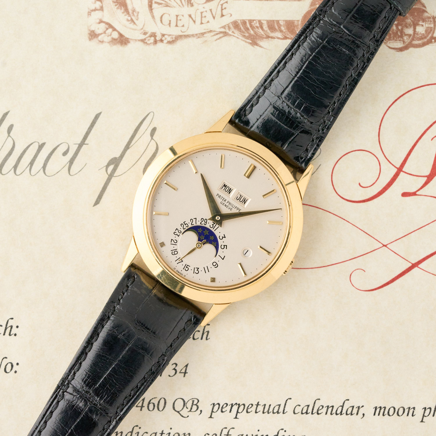 Patek Philippe Perpetual Calendar 3450J „Padellone” – 1984 – 18K sárga arany – Argenté számlap – Hibátlan állapot – Eredeti doboz és Extract from the Archives WR9946
