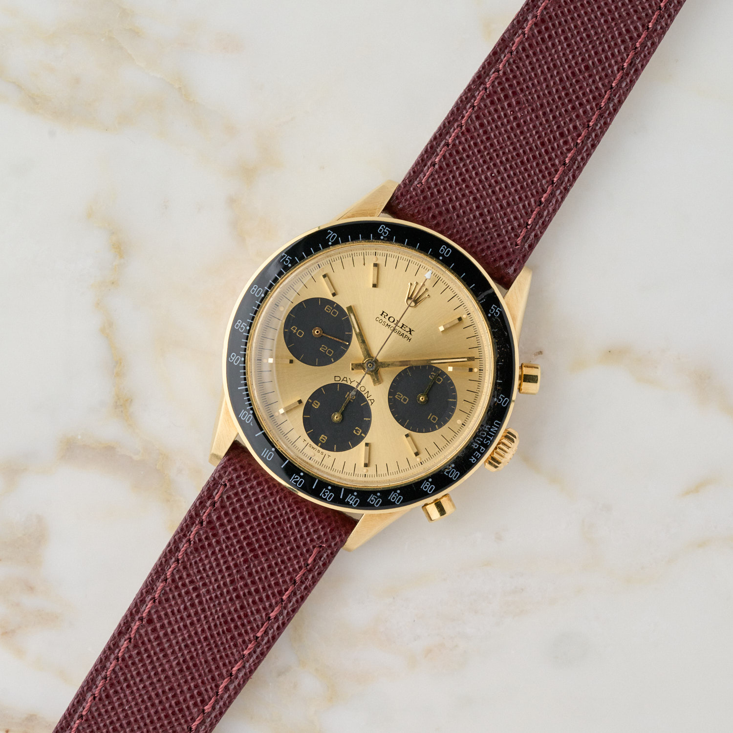 Rolex Daytona 6241 – 1967 – 14K sárga arany – Burgundi Saffiano bőrszíj Rolex ardillon csattal – Carlo Pergola Expertise – Kiváló állapot WR9951