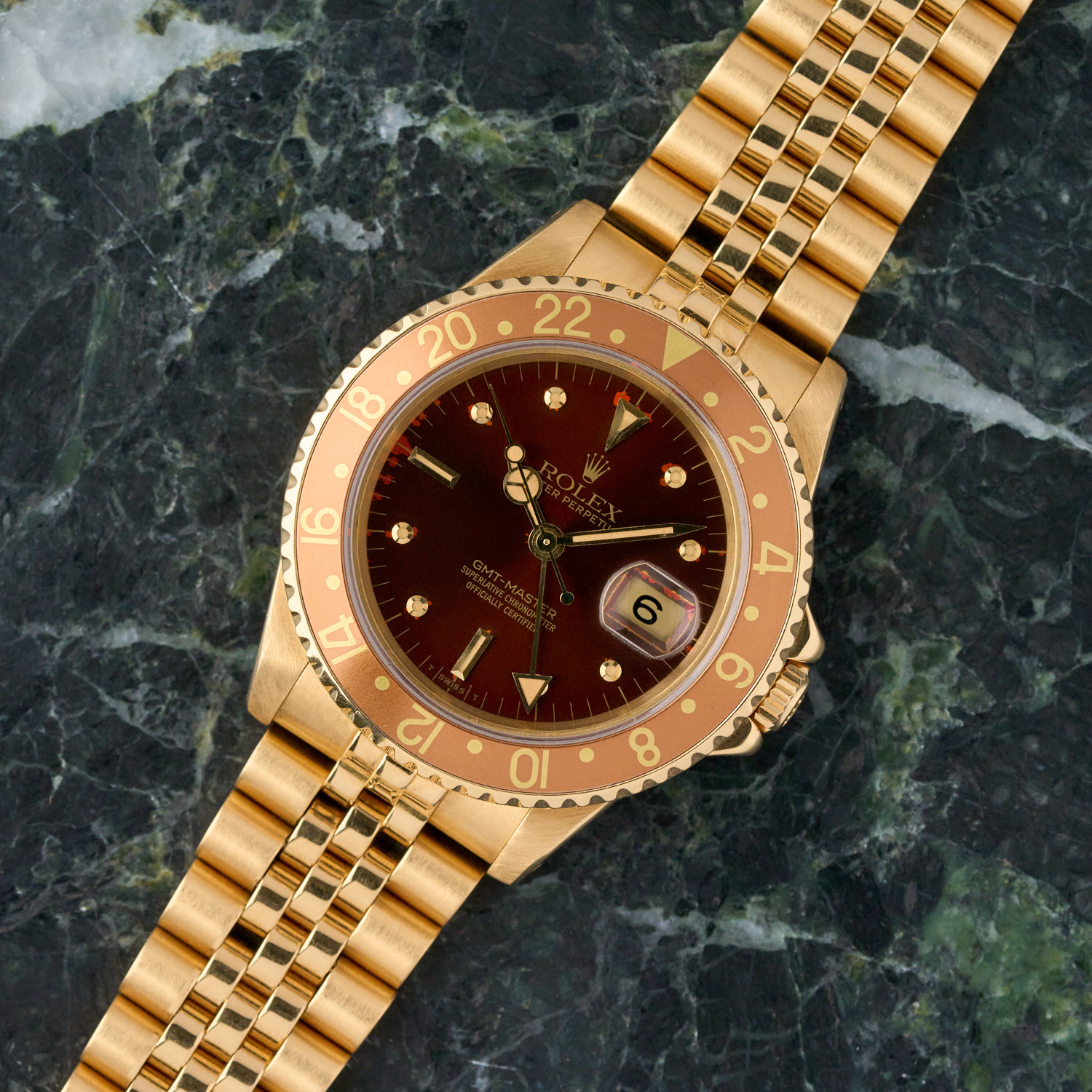 Rolex GMT Master 16758 – 1981 – 18K sárga arany – Barna számlap nipple indexekkel – Teljes szett – Kiváló állapot WR9944